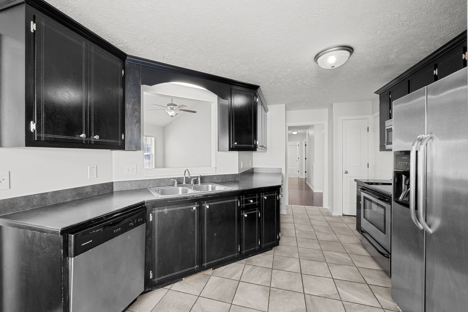 This home boasts three spacious bedrooms and two full bathrooms, offering ample space for comfort and relaxation. The modern kitchen, equipped with an electric stove, dishwasher, and built-in microwave. The home also features a laundry closet with washer/dryer connections for your convenience. The living area is enhanced by a gas log fireplace and a ceiling fan, ensuring a comfortable atmosphere in all seasons. Step outside to a charming patio, enclosed by a rear fence, offering a private outdoor space for relaxation or entertaining. The property also includes a two-car attached garage, providing parking and additional storage.