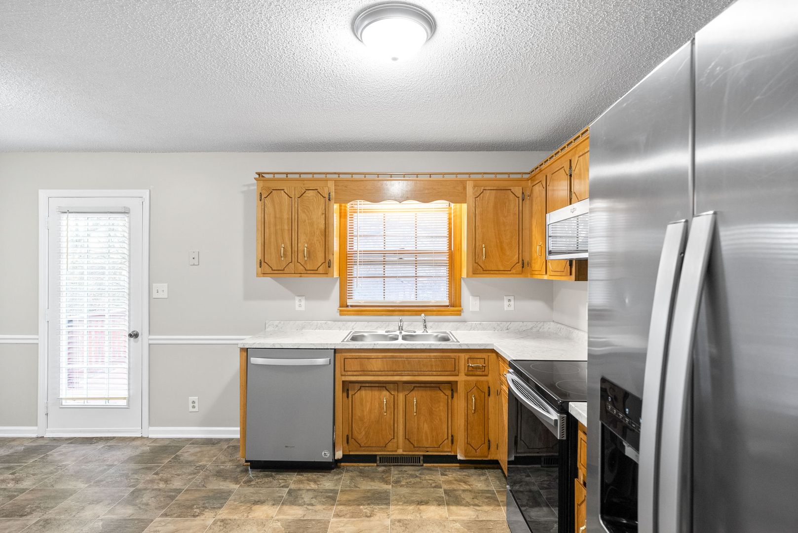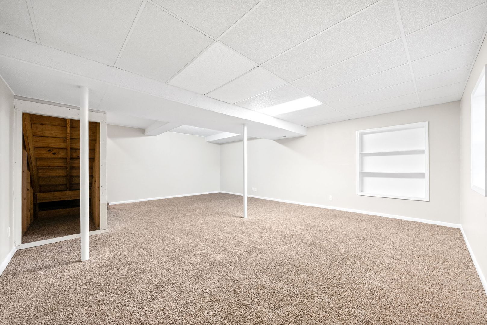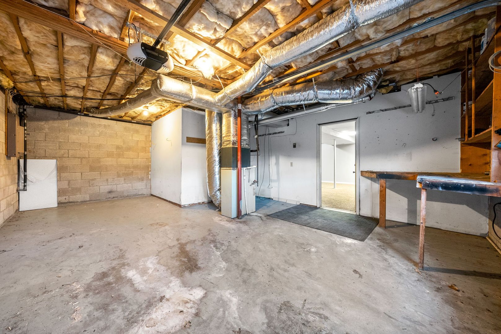 This home boasts four spacious bedrooms, each equipped with walk-in closets and ceiling fans for your comfort. The house features two full bathrooms, a partially finished basement, and a two-car garage, providing ample space for all your needs. The eat-in kitchen, complete with a pantry, is perfect for those who love to cook. The house also offers washer and dryer connections for your convenience. The flooring is a mix of laminate and carpet. The exterior of the house features a covered front porch and a back deck, perfect for outdoor relaxation or entertaining. The property is enclosed by a chain-link fence.